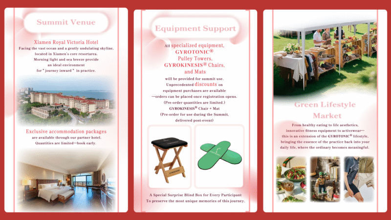 We’re happily sharing the news about an upcoming GYROTONIC® and GYROKINESIS® International Summit in Xiamen, China May 15-17, 2026 Organized by TT Pilates in Xiamen. This summit is open to licensed Gyrotonic and Gyrokinesis Trainers, students and clients. The Summit will features classes led by 17 globally recognized Master Trainers, roundtable dialogues, a green lifestyle market and much more.