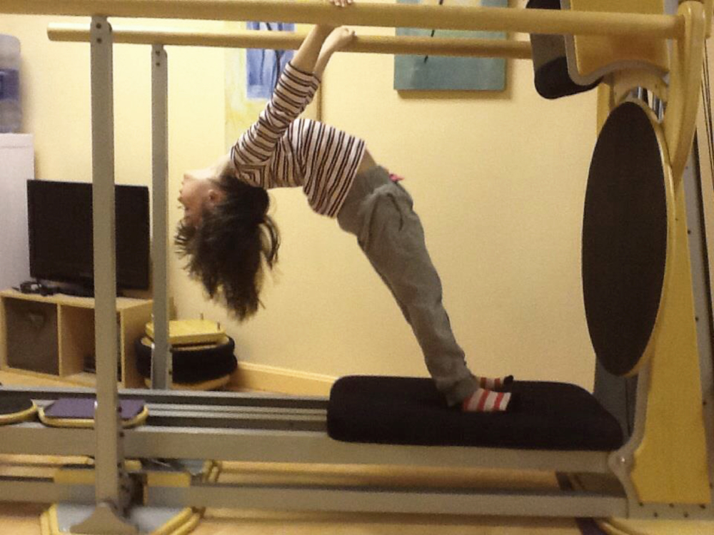 When l work with children I approach their session as a time of play. We usually start with some hamstring sequences, because what child does not like to swing around by their legs and wave them around. I teach them small amounts of form and direction. But l also let them have fun and wiggle around and find out at what point the pulleys will take them off the bench. And we count only for fun, not to repeat a set number of anything.